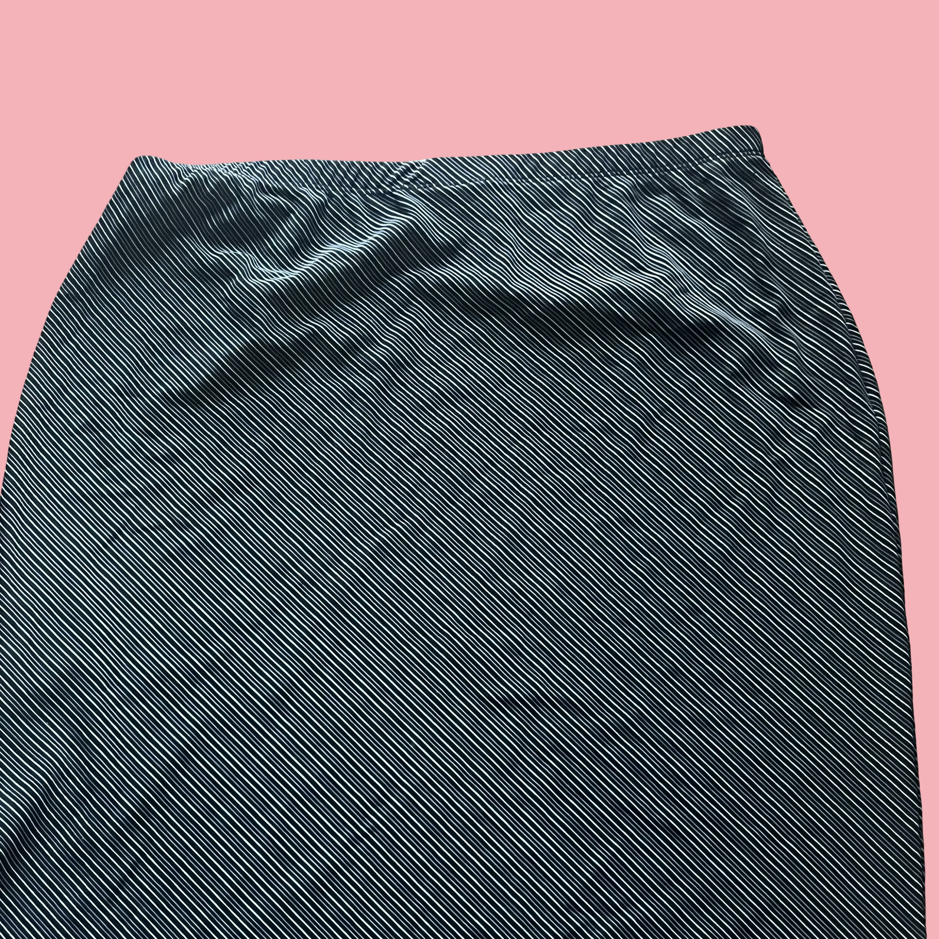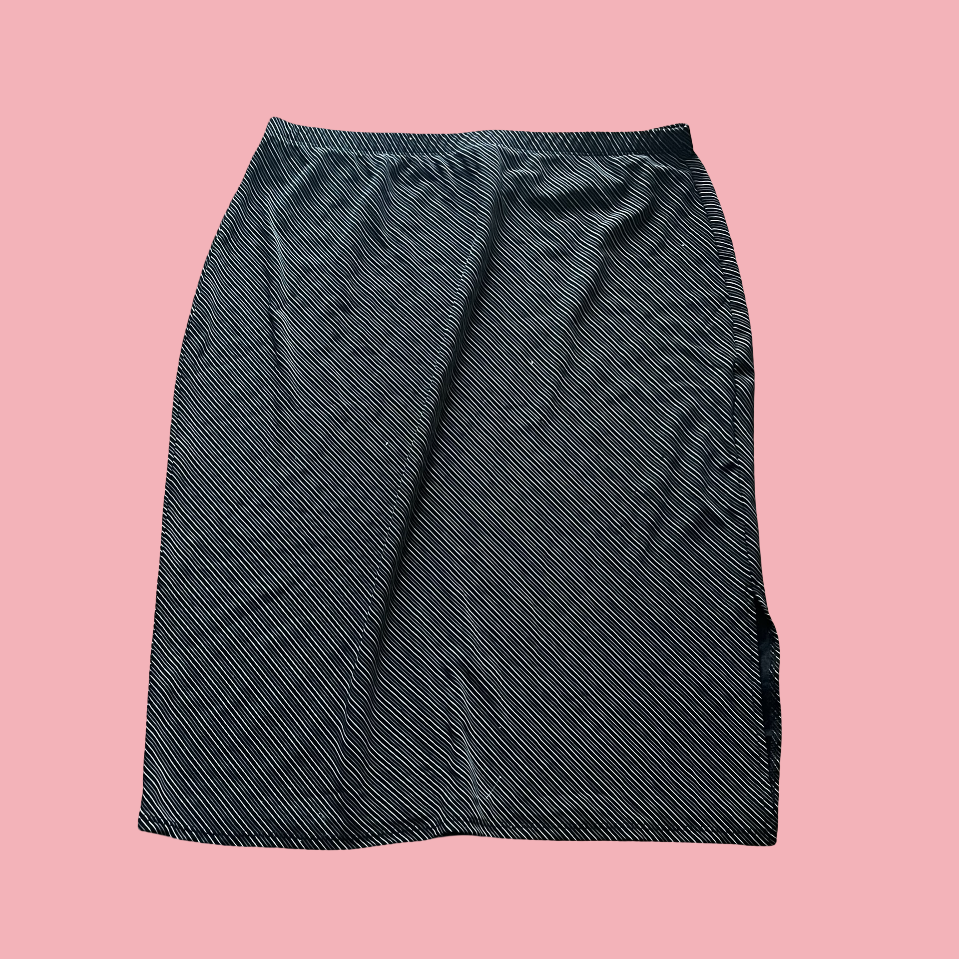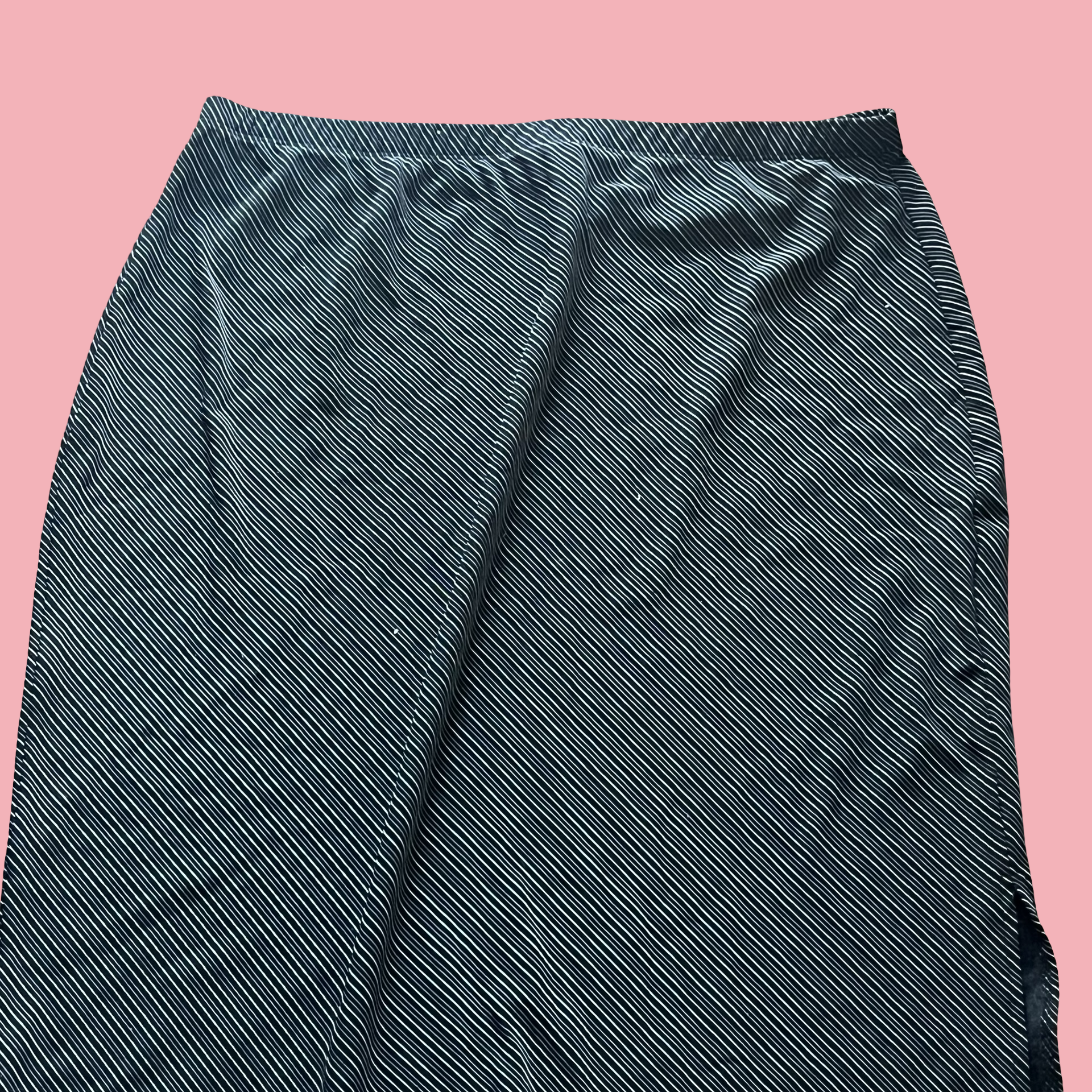 Classic early-2000s vibe with thin white diagonal pinstripes and a stretchy elastic waistband for that comfy low-effort fit. Midi length with a clean, straight silhouette—perfect styled with a baby tee, halter top, or cropped cardigan. Very office siren meets Y2K energy.