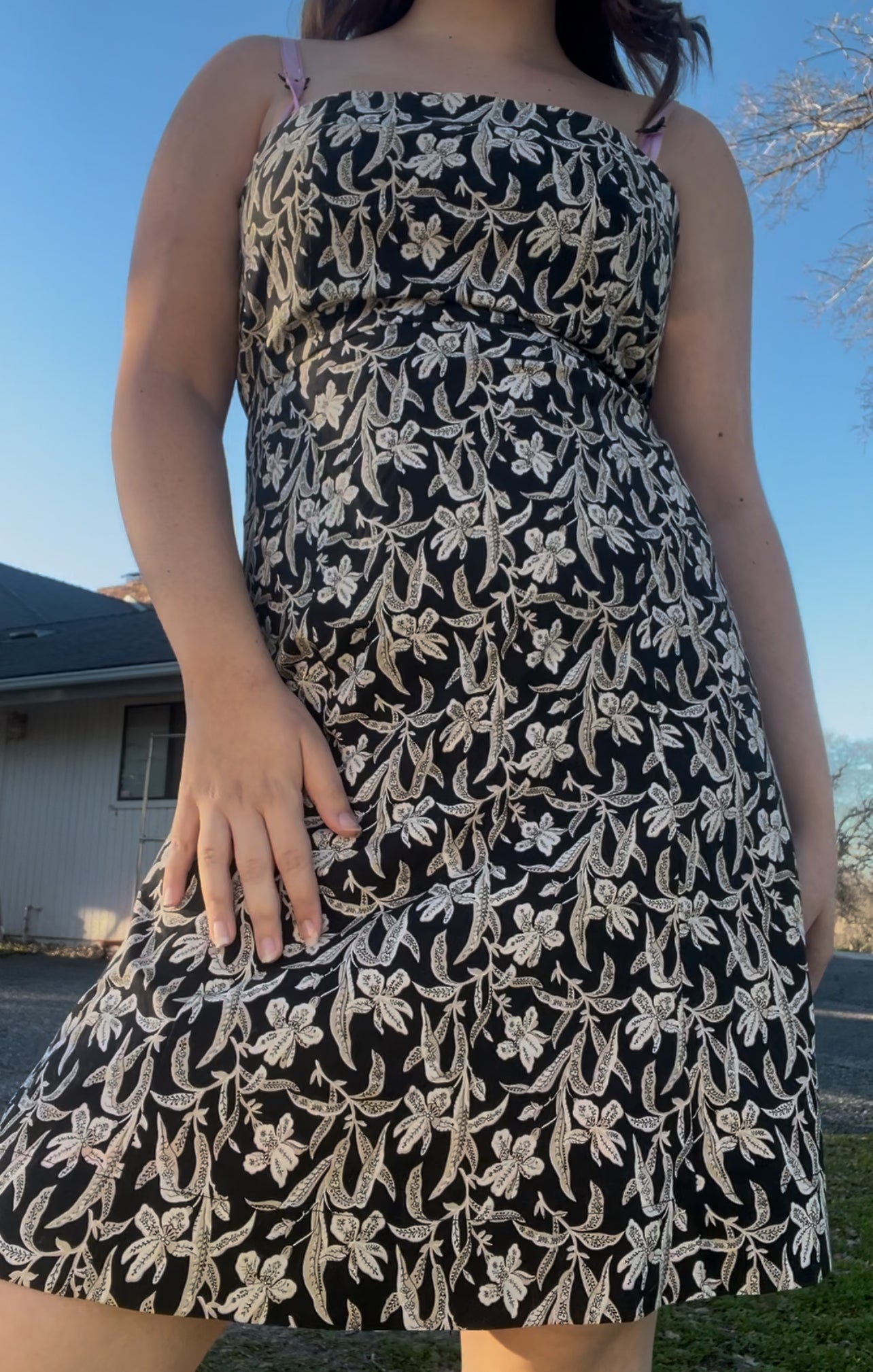 Cute vintage-inspired GAP mini dress with an all-over cream floral vine print on a black base 🖤🤍