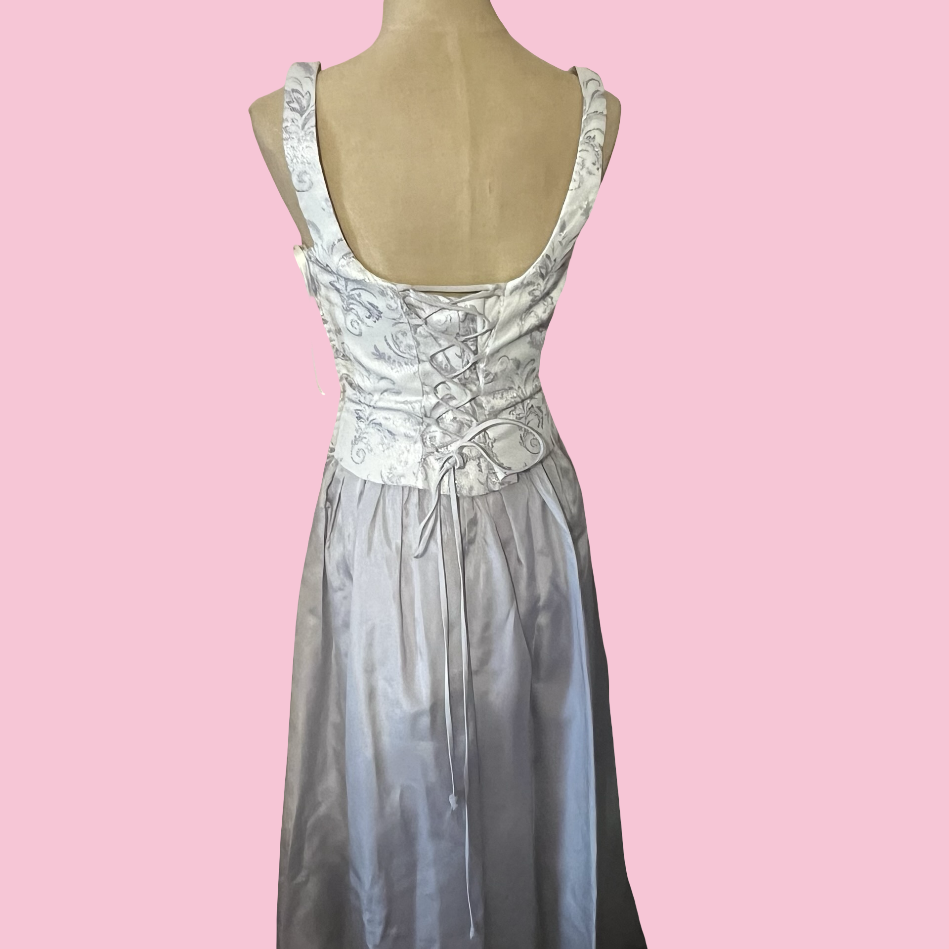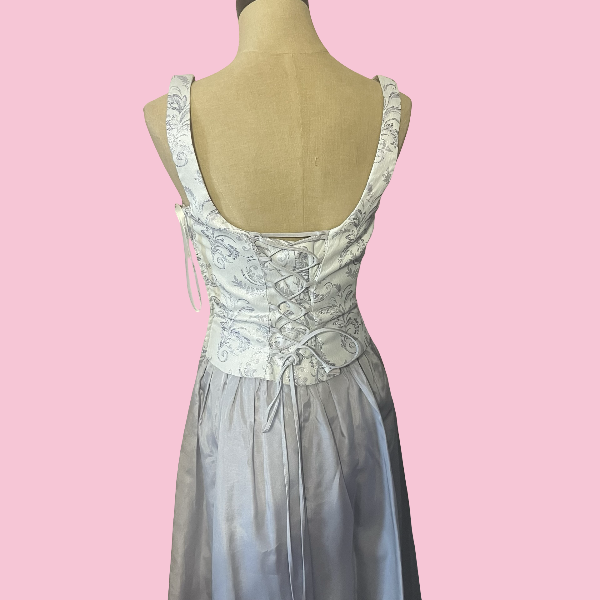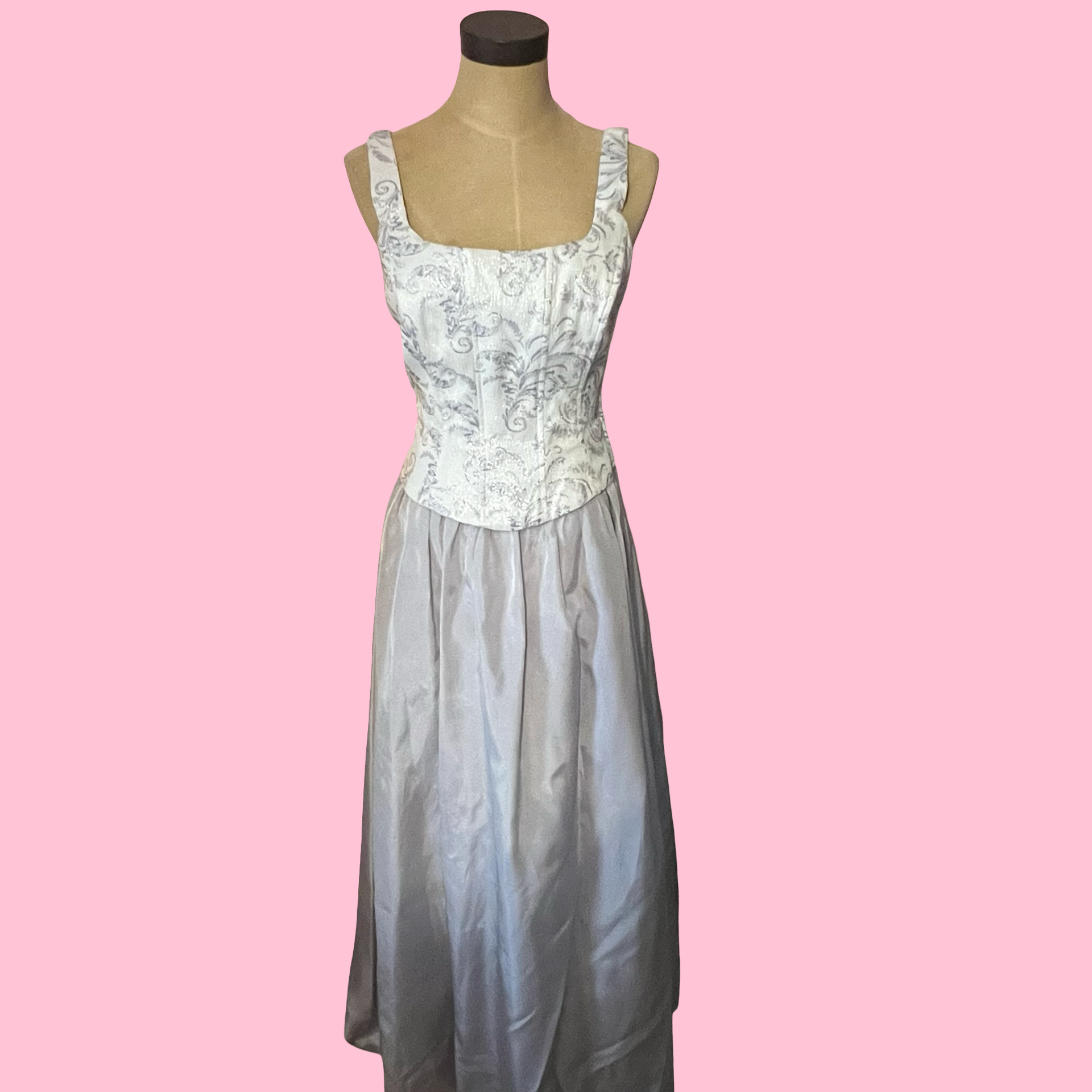 Beautiful 90s vintage dress with a structured corset-style bodice and a soft, flowy skirt. Features a silver/grey floral brocade top with wide straps and a flattering square neckline. Perfect for formal events, vintage lovers, prom, or a fairy/romantic aesthetic 🩶