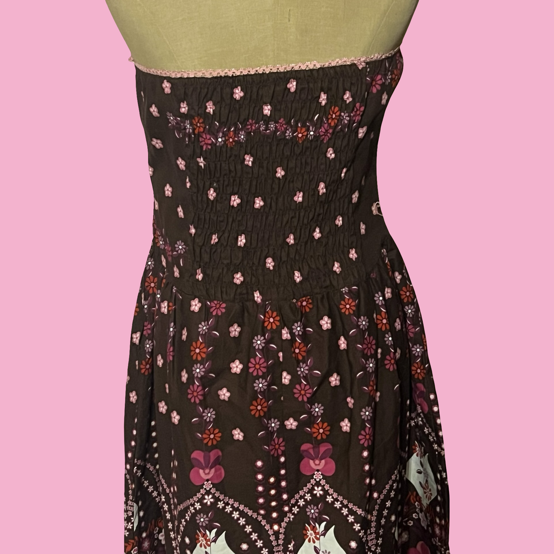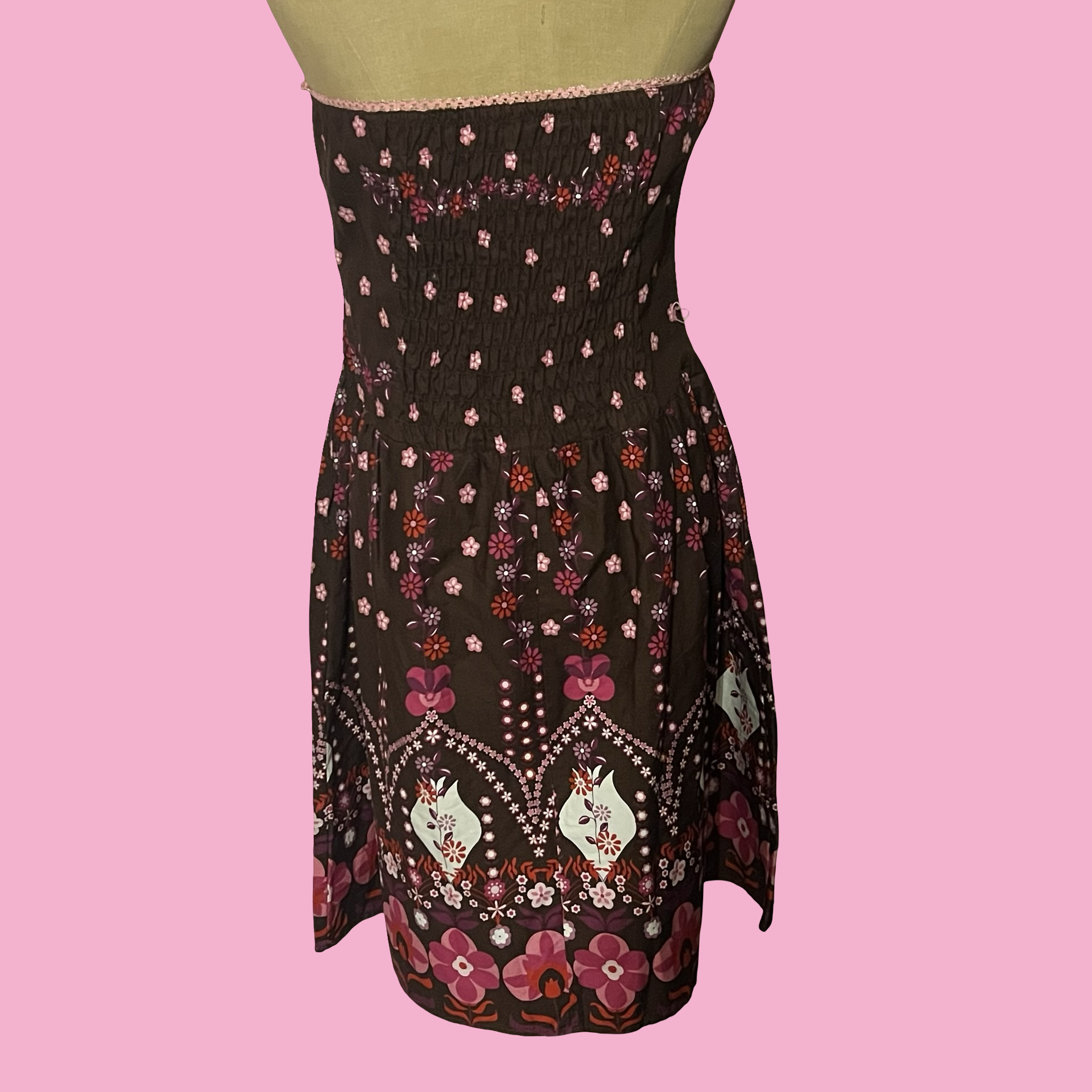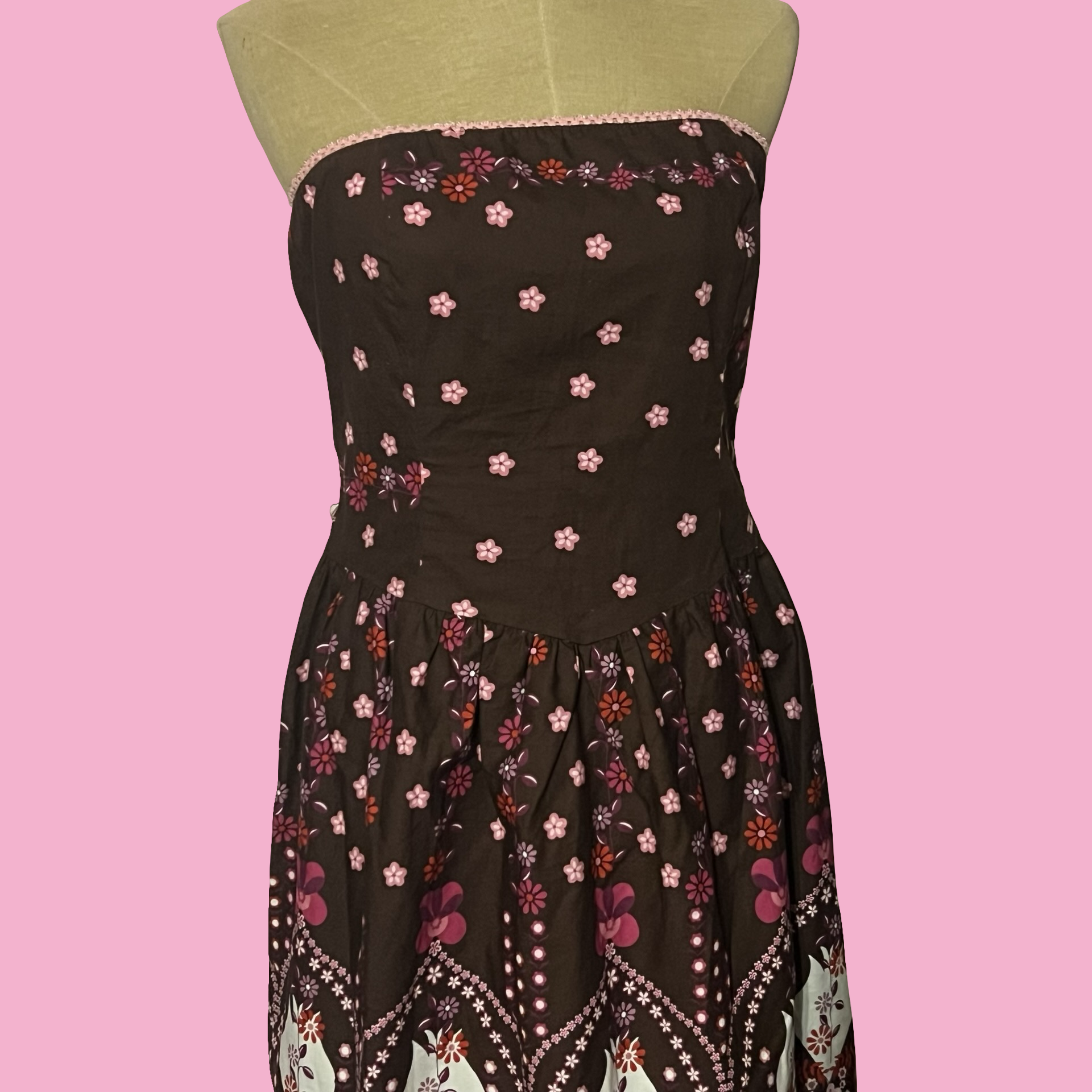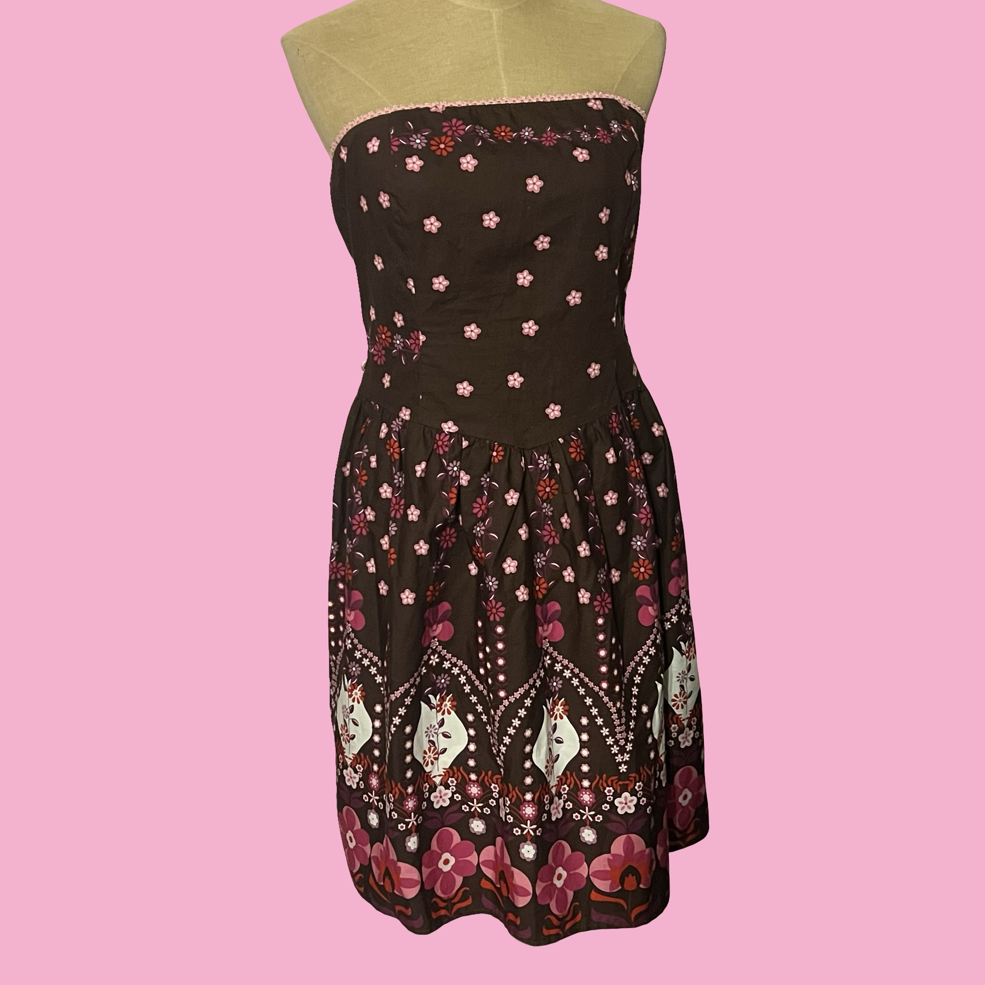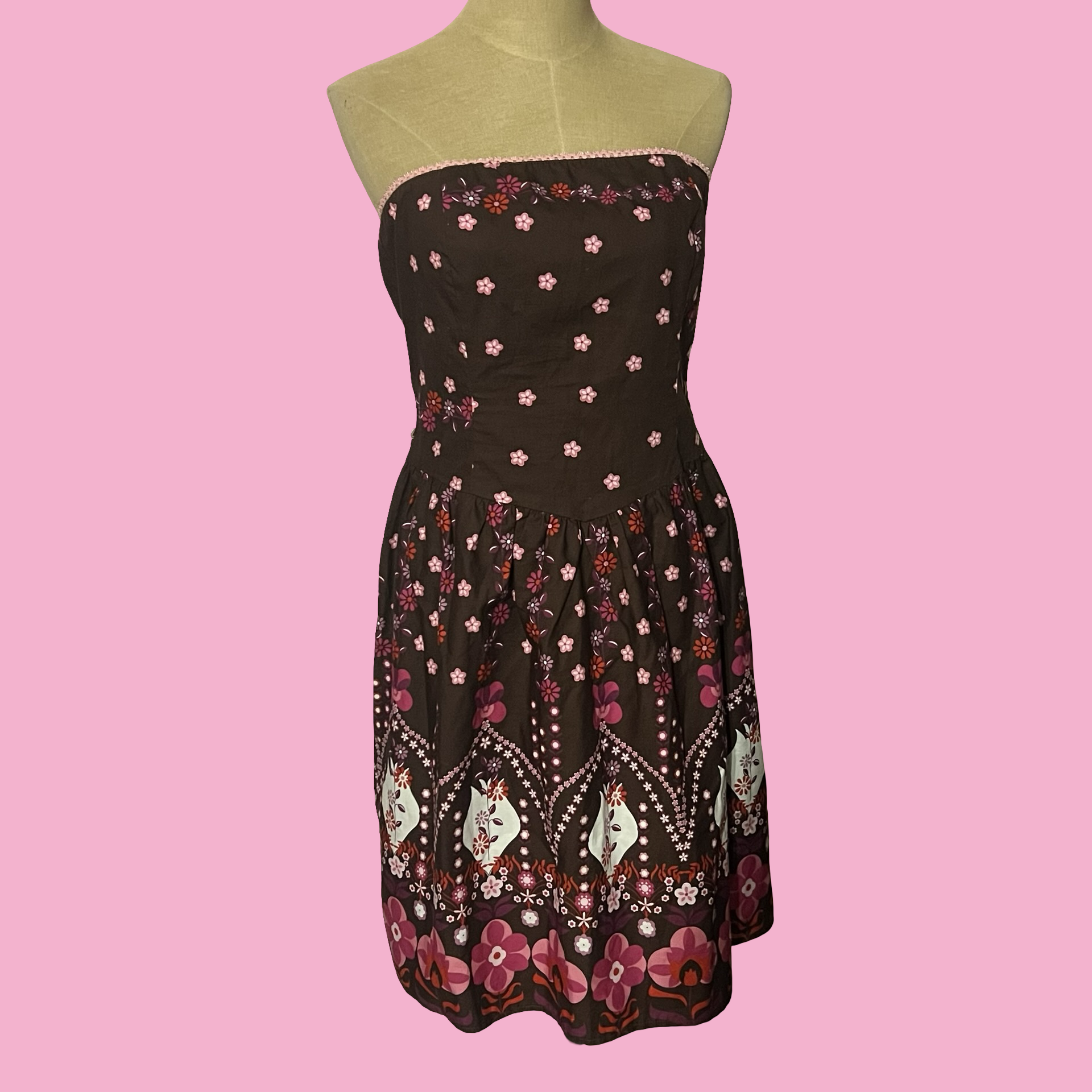 Cute early 2000s Ruby Rox strapless dress featuring a brown base with pink floral print and a bold boho/folk-inspired border. Flattering fitted bodice with a flowy A-line skirt — the perfect mix of Y2K, girly, and bohemian vibes.
