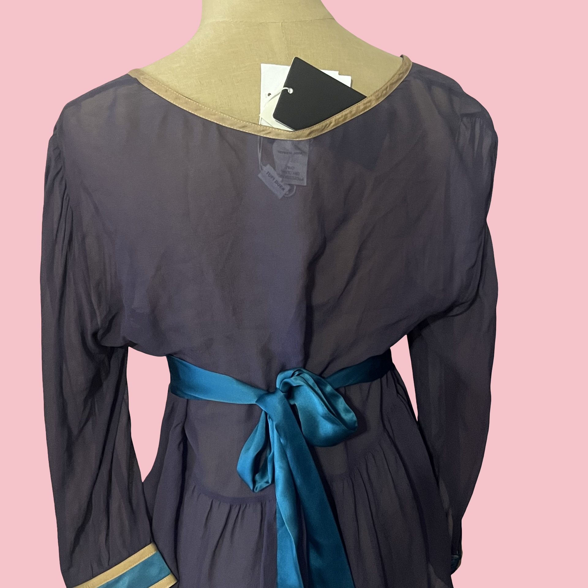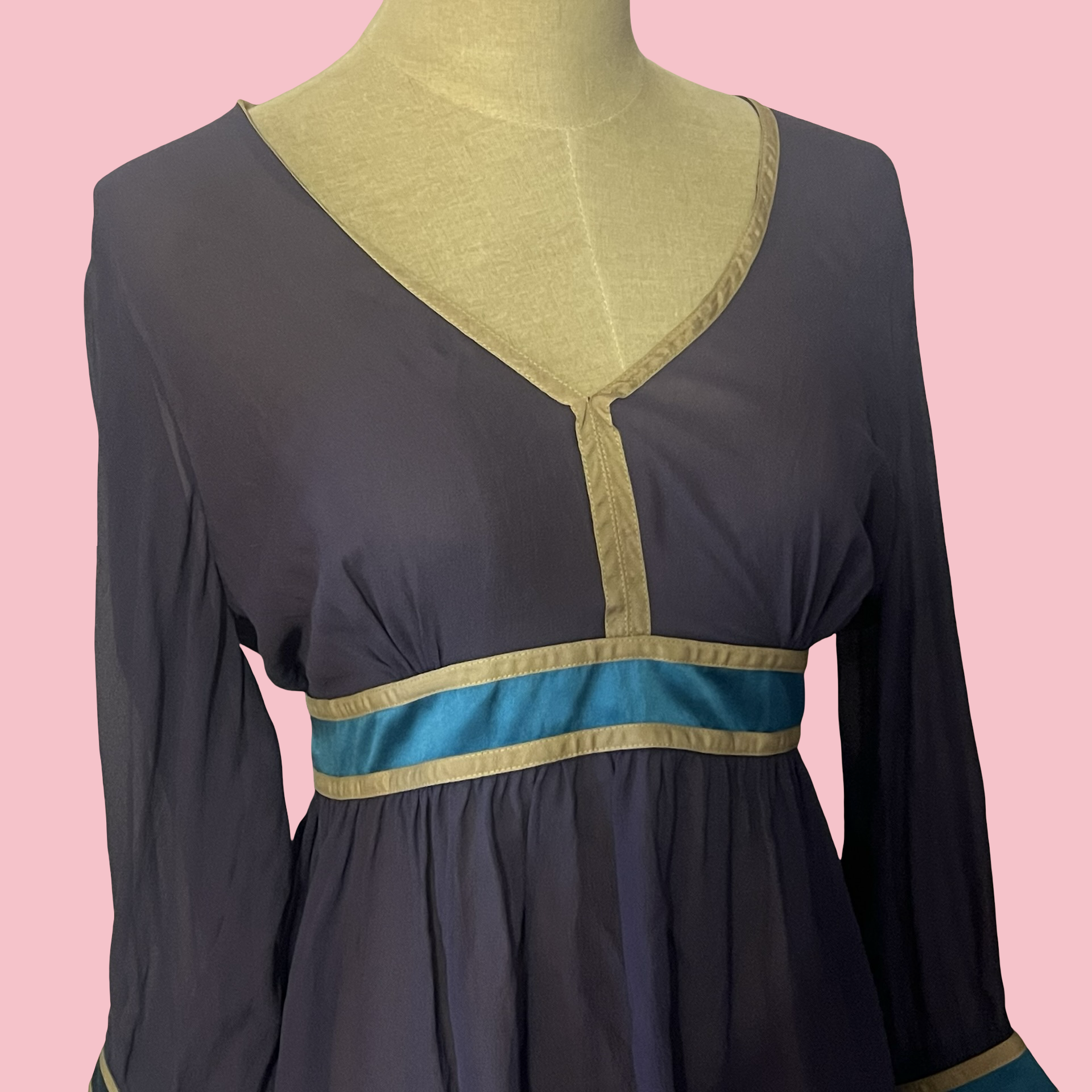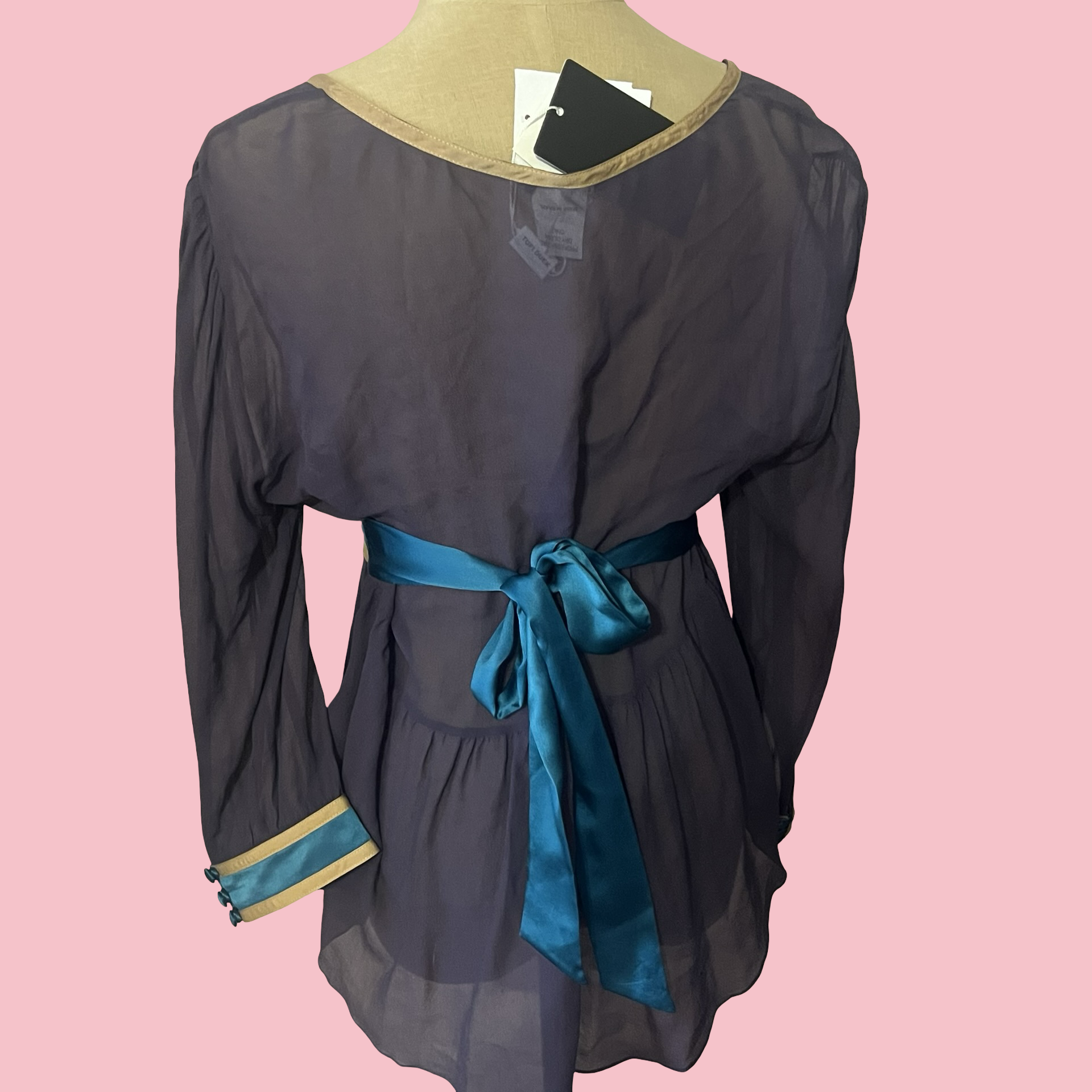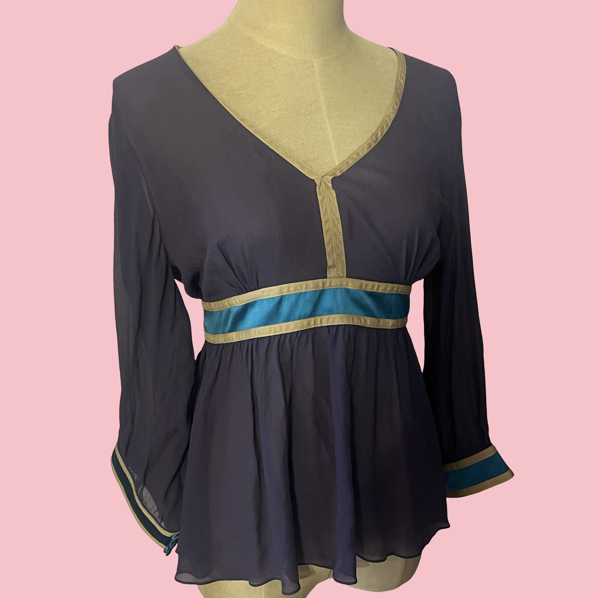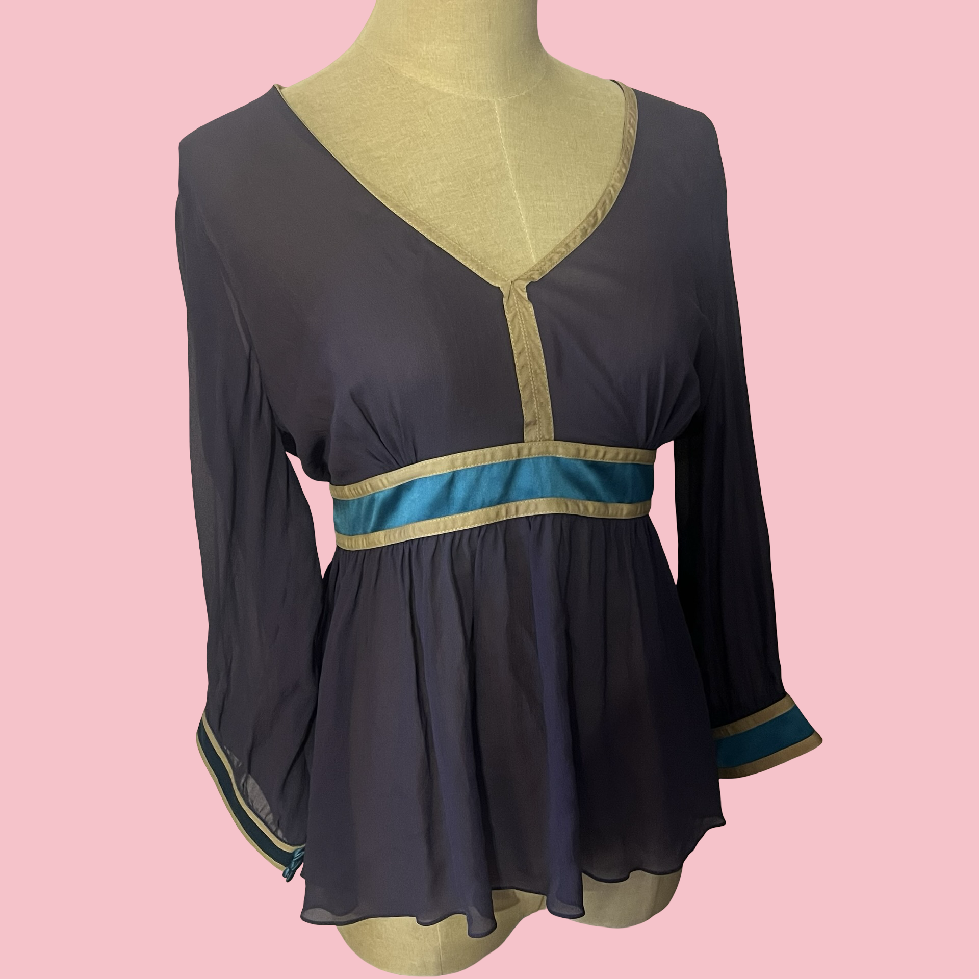 New with tags Tufi Duek sheer long sleeve blouse featuring a deep V neckline, empire waist fit, and contrast teal and gold trim. Flowy, lightweight fabric with an elegant drape — flattering and easy to style up or down. Rare designer piece with a classic Y2K silhouette.
