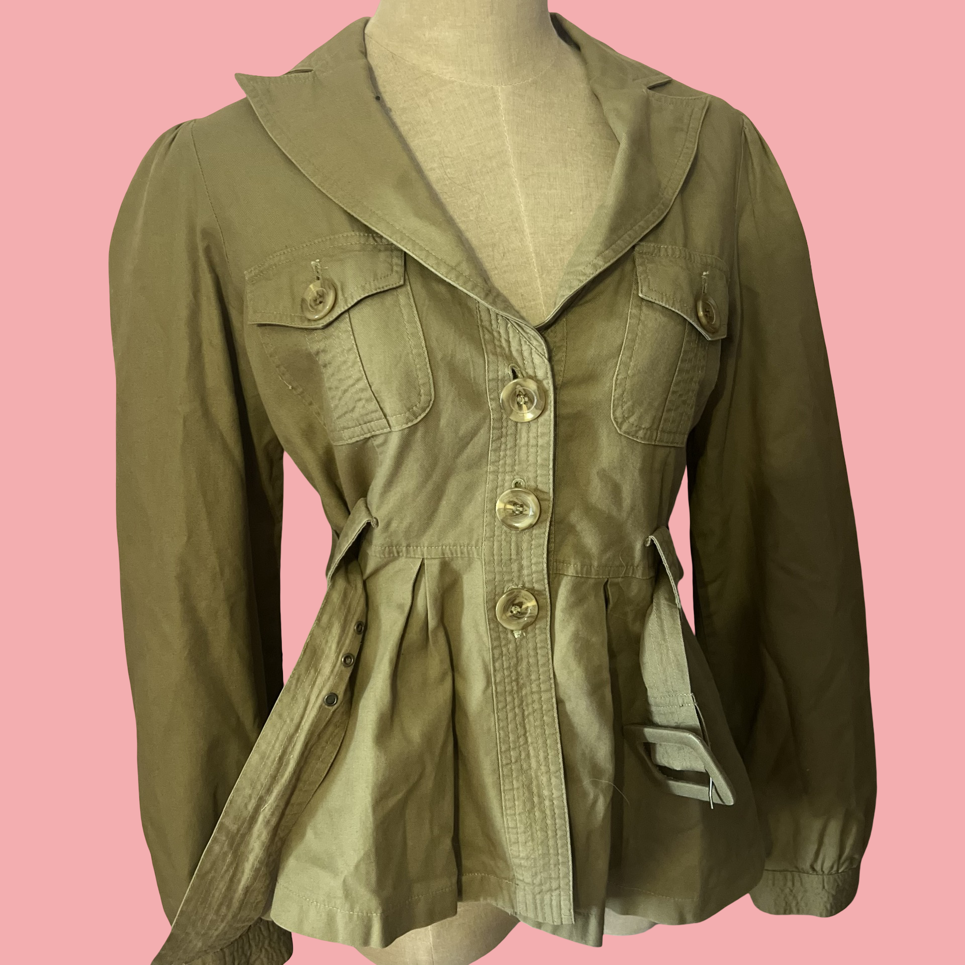 Women's Olive Green Belted Utility Jacket – Vintage Military Style | Size Medium